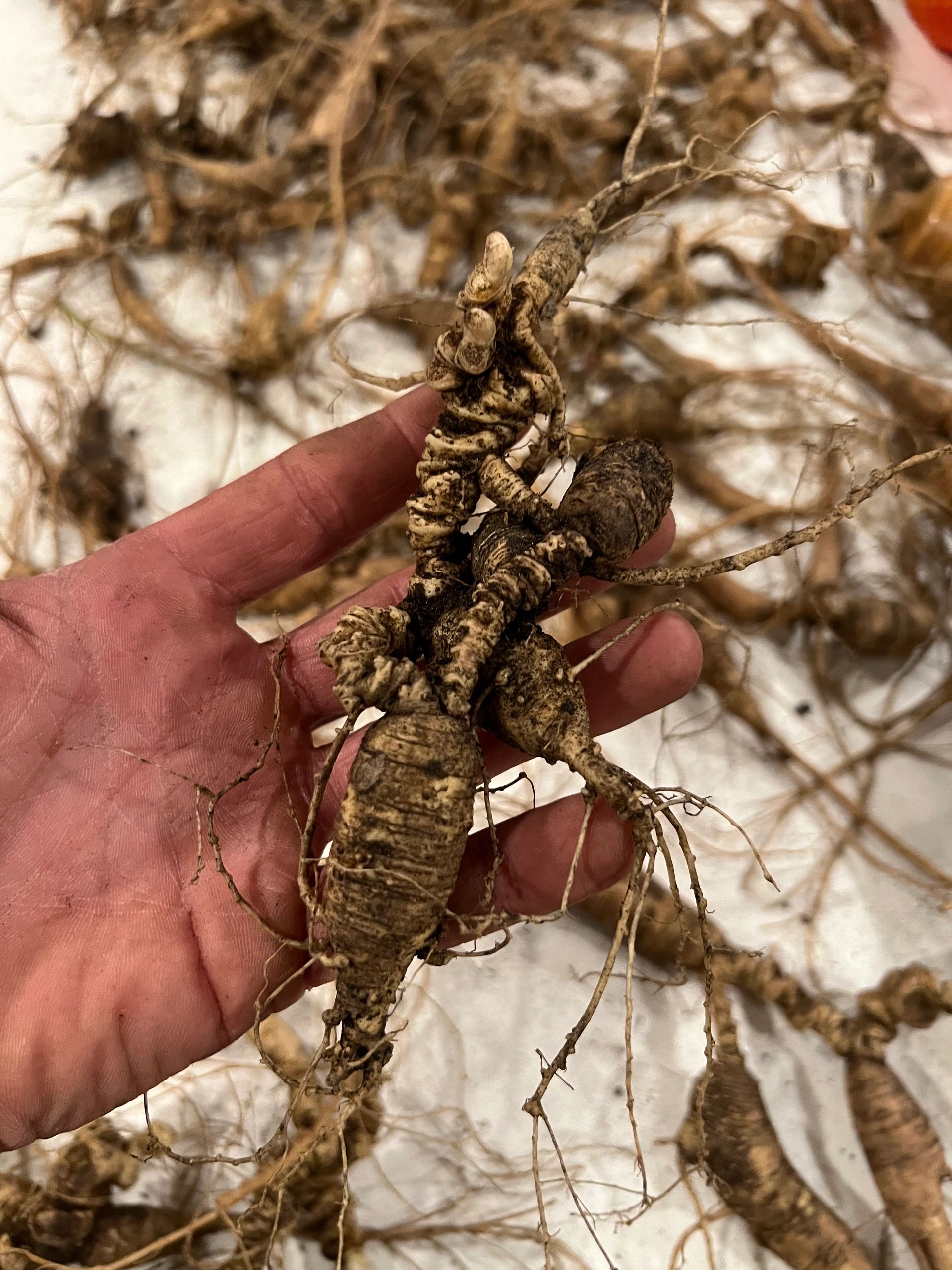 Fresh 0.8 ounce root. Perfectly dug with no visible damage. Main body intact. Original (father) body missing due to old age and/or natural causes. 100+ years old.